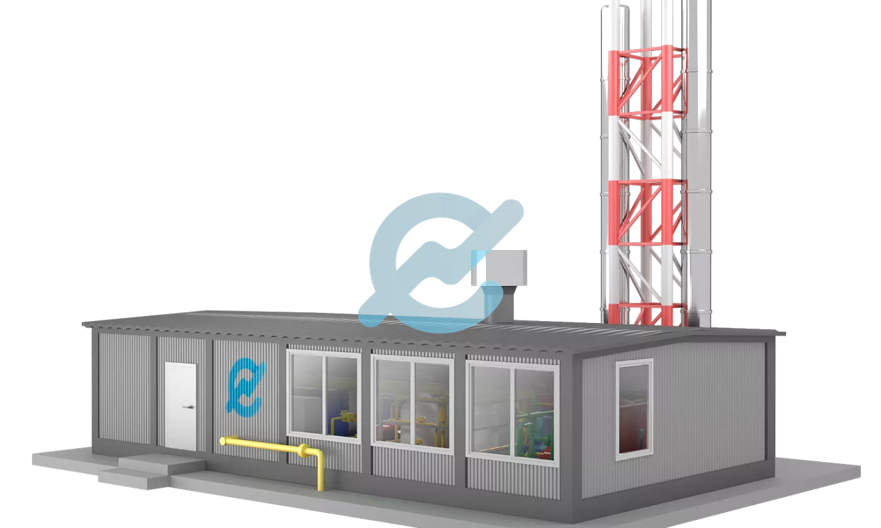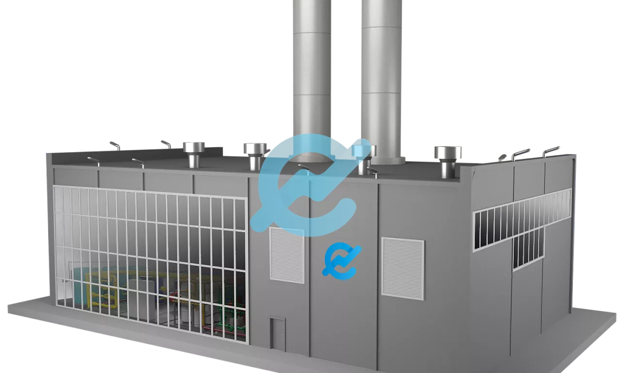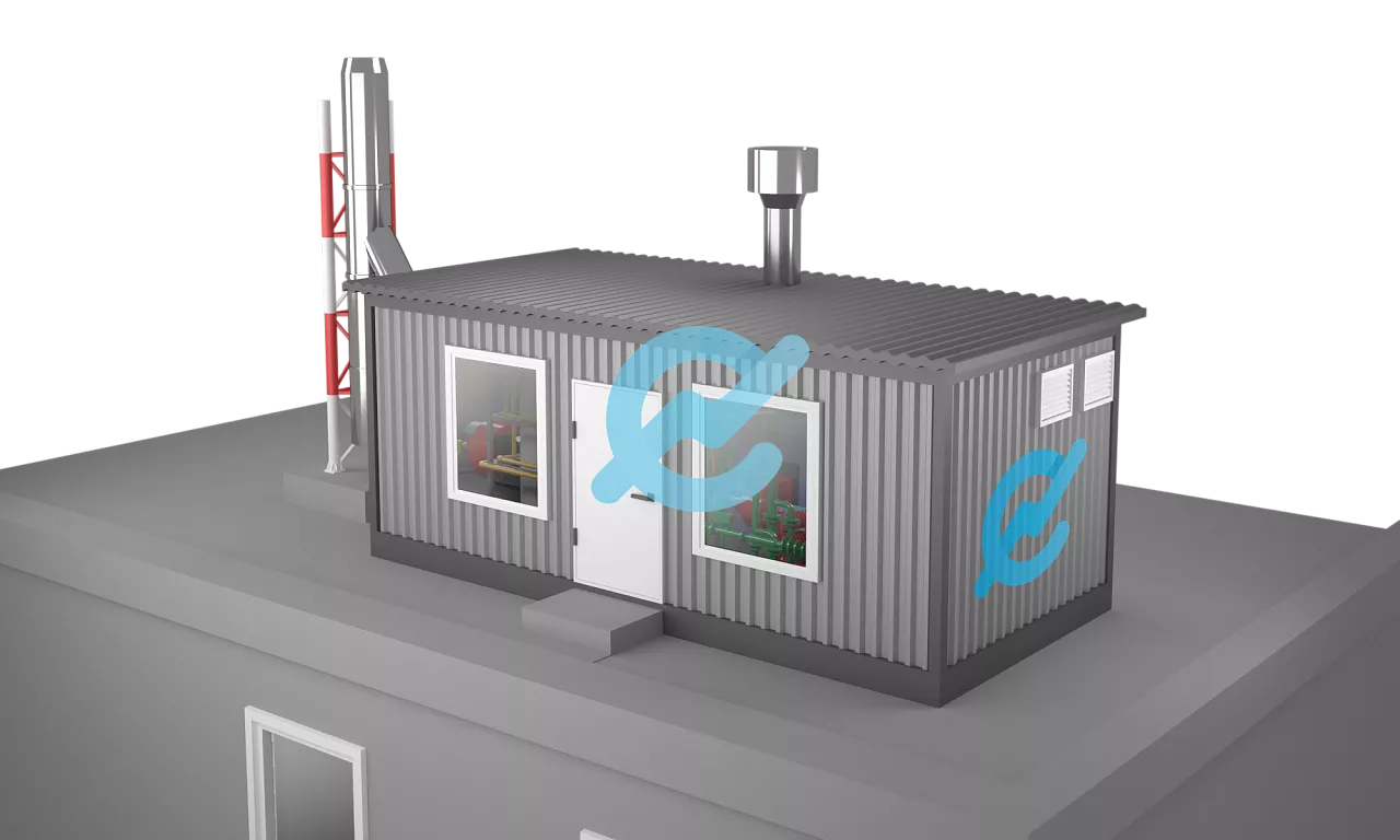 Каркасная котельная это котельная в здании каркасного типа. Все узлы (обвязка котлов, насосов, теплообменников и т.д.), а так же элементы здания (стойки, фермы, ограждения, перекрытия и т.д.) изготавливаются на производстве, потом доставляются на стройплощадку, где происходит их монтаж.